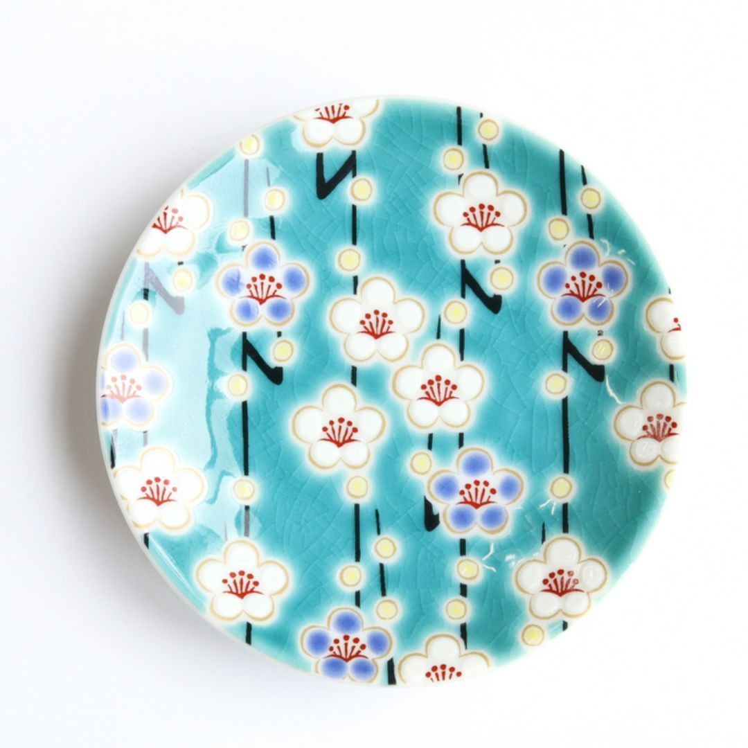●爽やかな青磁色の地と白梅のコントラストで、愛らしい梅の花が咲き誇る、華やかで美しいデザインの豆皿です。