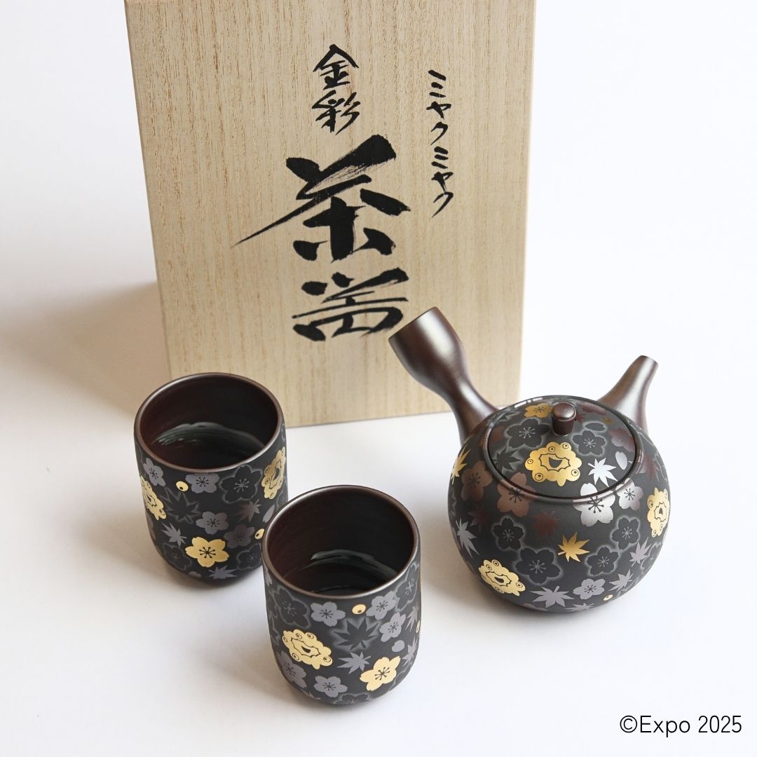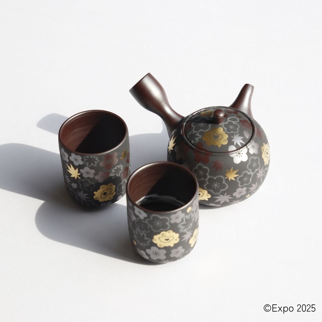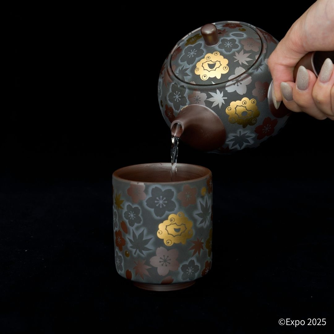 ● 手になじむ滑らかな質感と落ち着いた色合いが特徴の万古焼に、桜・紅葉の模様にミャクミャクを金彩で施した遊び心ある茶器です。