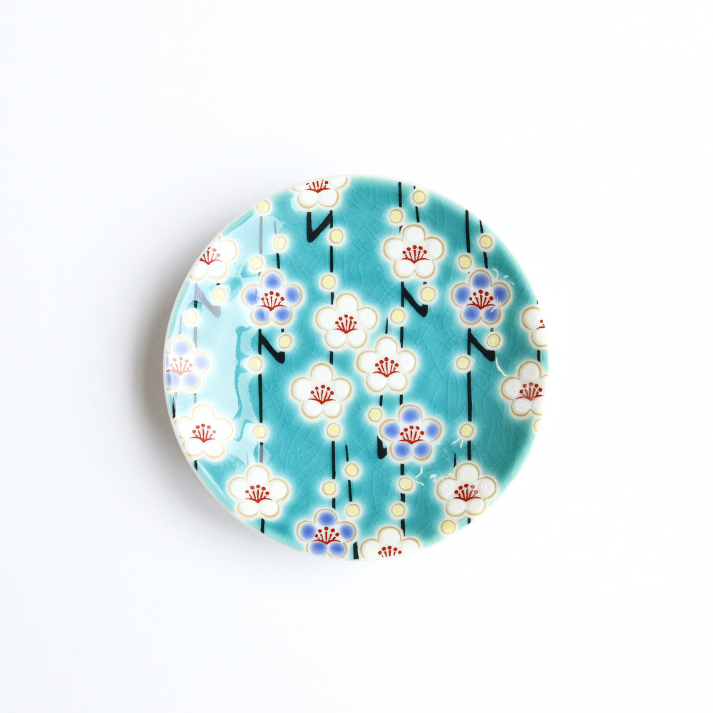 ●爽やかな青磁色の地と白梅のコントラストで、愛らしい梅の花が咲き誇る、華やかで美しいデザインの豆皿です。
