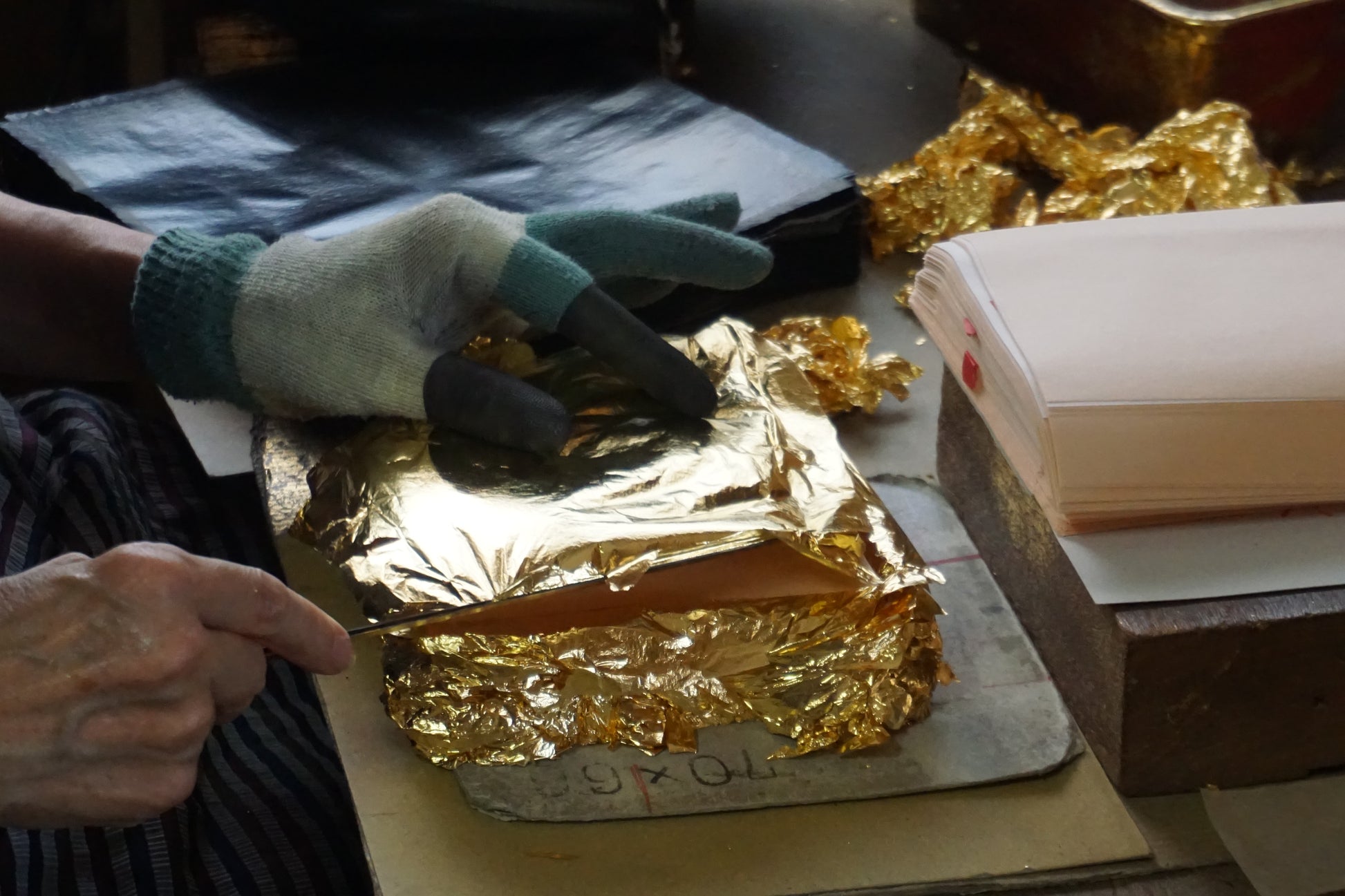 ● 金沢箔の特徴は、金の輝きを失わせることなく、1万分の1ミリ程度の厚さまで均一に広げる職人の技術にあります。