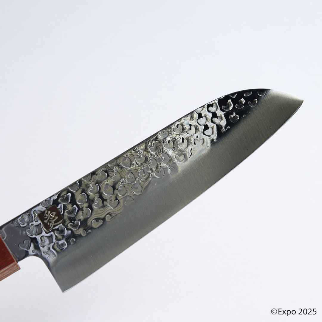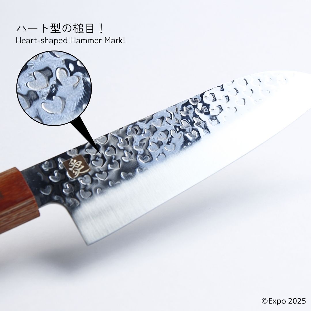 ●一目で心を奪う、ハート柄の鎚目模様をあしらった、 美しくも実用的な包丁。ハート柄の鎚目模様は、熟練の職人が一点ずつ打ち出しています。