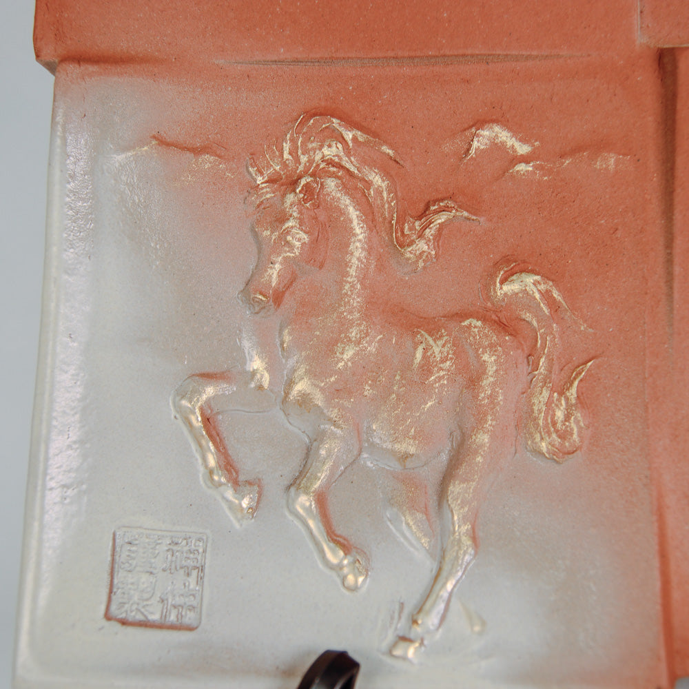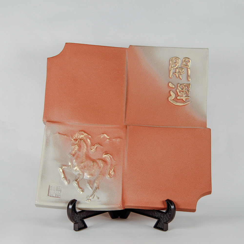2026年(丙午)の干支である「午」は、情熱、行動力、飛躍の象徴とされます。この干支瓦は、力強く駆ける「一頭の馬」の姿と、新年の福を呼び込む「開運」の文字を立体的にデザインしています。