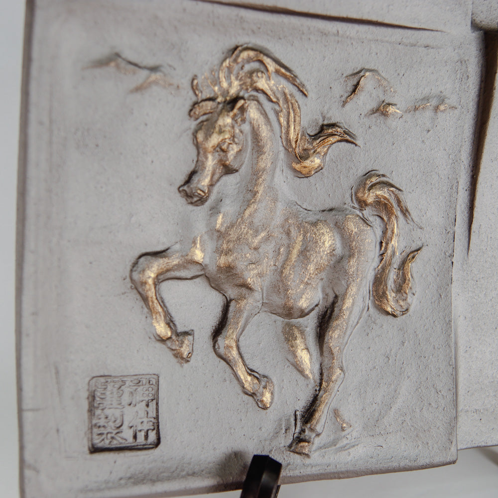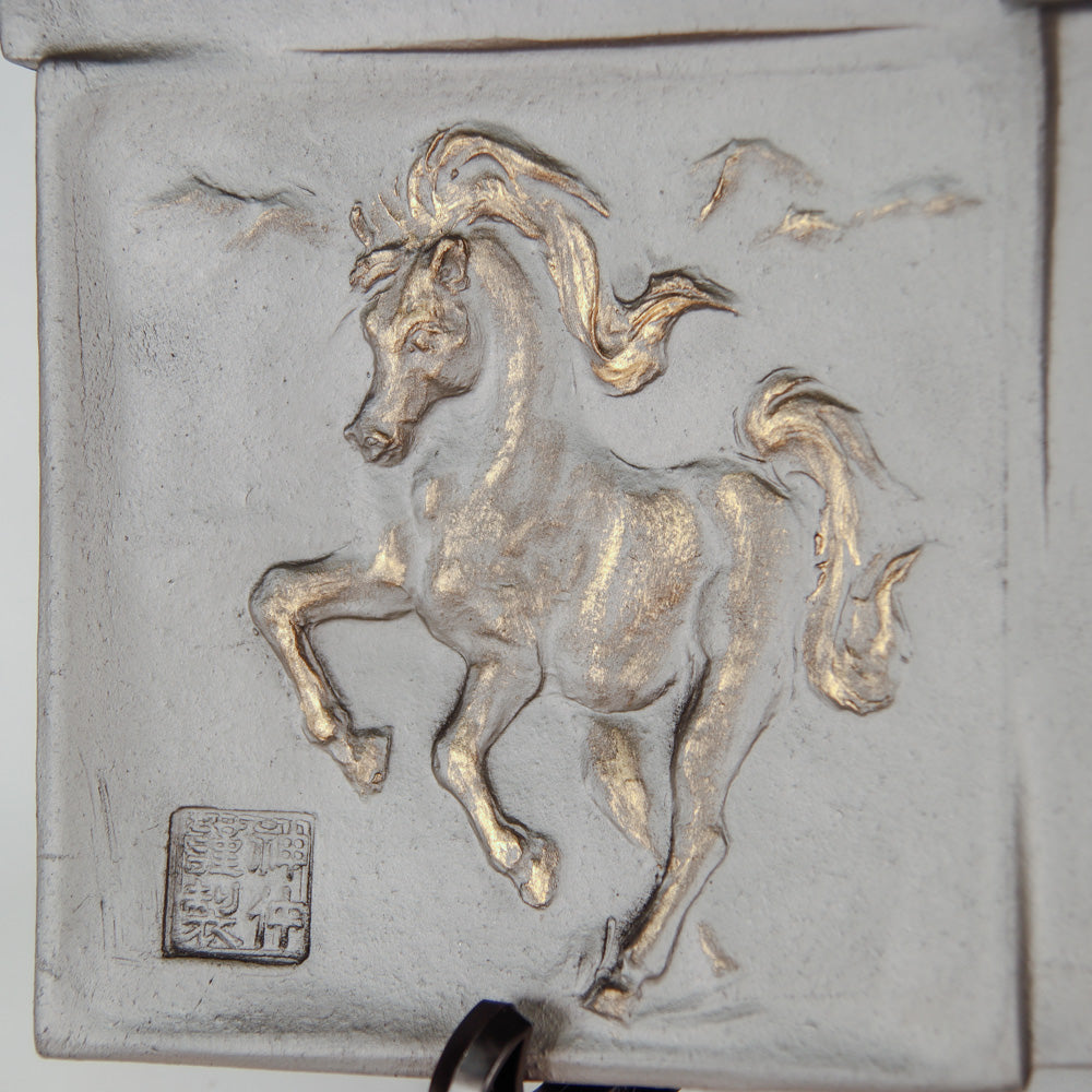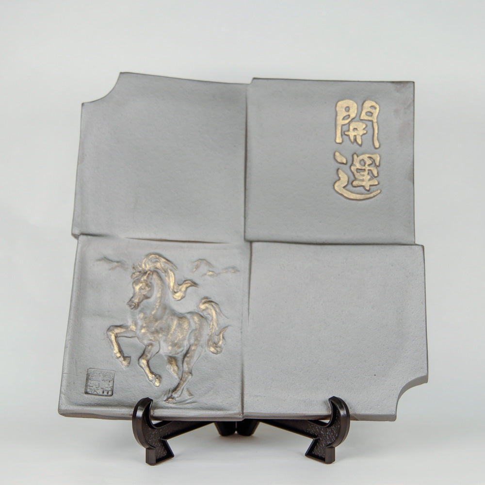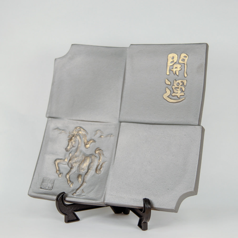 2026年(丙午)の干支である「午」は、情熱、行動力、飛躍の象徴とされます。この干支瓦は、力強く駆ける「一頭の馬」の姿と、新年の福を呼び込む「開運」の文字を立体的にデザインしています。