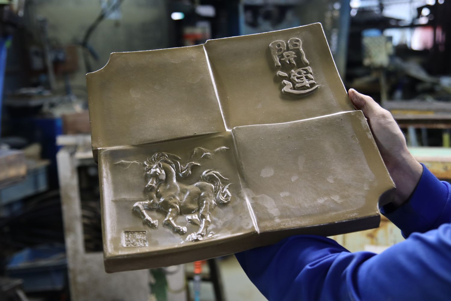 神谷氏が語るように、瓦づくりは「縮み」や「ねじれ」を読む、長年の経験と勘がすべて。日々鬼瓦と向き合う職人たちの、100年を超える伝統技術がこの干支瓦にも息づいています。